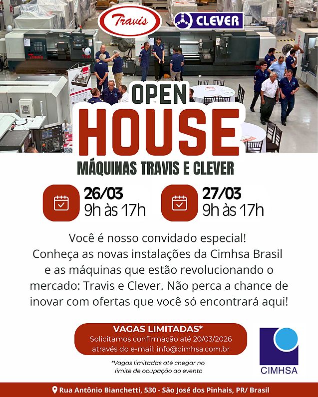 Venha conhecer nossas novas instalações e os lançamentos das linhas Travis e Clever. Um encontro estratégico para representantes e clientes com condições comerciais únicas, válidas apenas para o evento. ⚙️